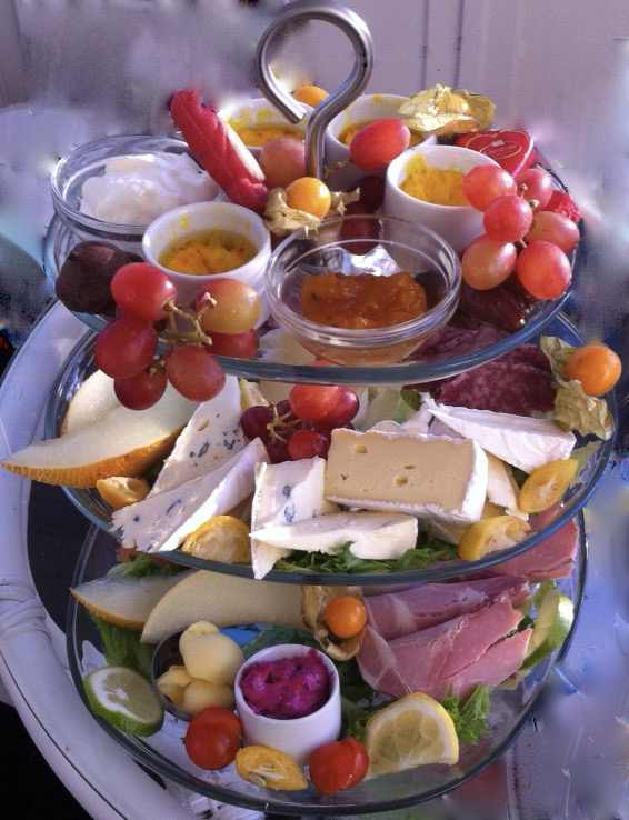 Vi serverar ett våningsfat där godsakerna samsas och som ni plockar ifrån. Där finns närproducerad skinka, ungsbakad enligt Cajsa Warg, med rödbetssallad och två sorters senap, italiensk salami med cornichonger, lax, ägghalvor och hovmästarsås, Hagalunds sill – löksill och senapssill, julost, brie & cambozola, melon, vindruvor, oliver och physalis. Gotländsk saffranspannkaka med grädde och hjortronsylt, dadlar och julgotter. Till detta en brödkorg med vörtbröd från Jörlanda bageri, nybakt fralla och knäckesticks.