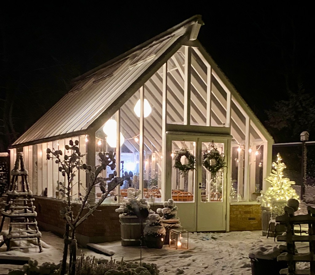 I vårt vackra växthus brinner brasan och det andas julstämning och frid.